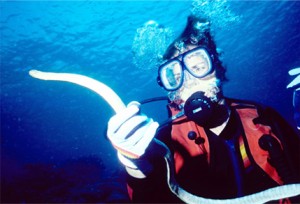 I held the sea snake for two seconds, long enough for my husband to take his picture. You can see how worried I look behind my diving mask. But truly it’s really very hard to be bitten by a sea snake. I’d have to put my finger down the snake’s throat – and I’m not THAT crazy.